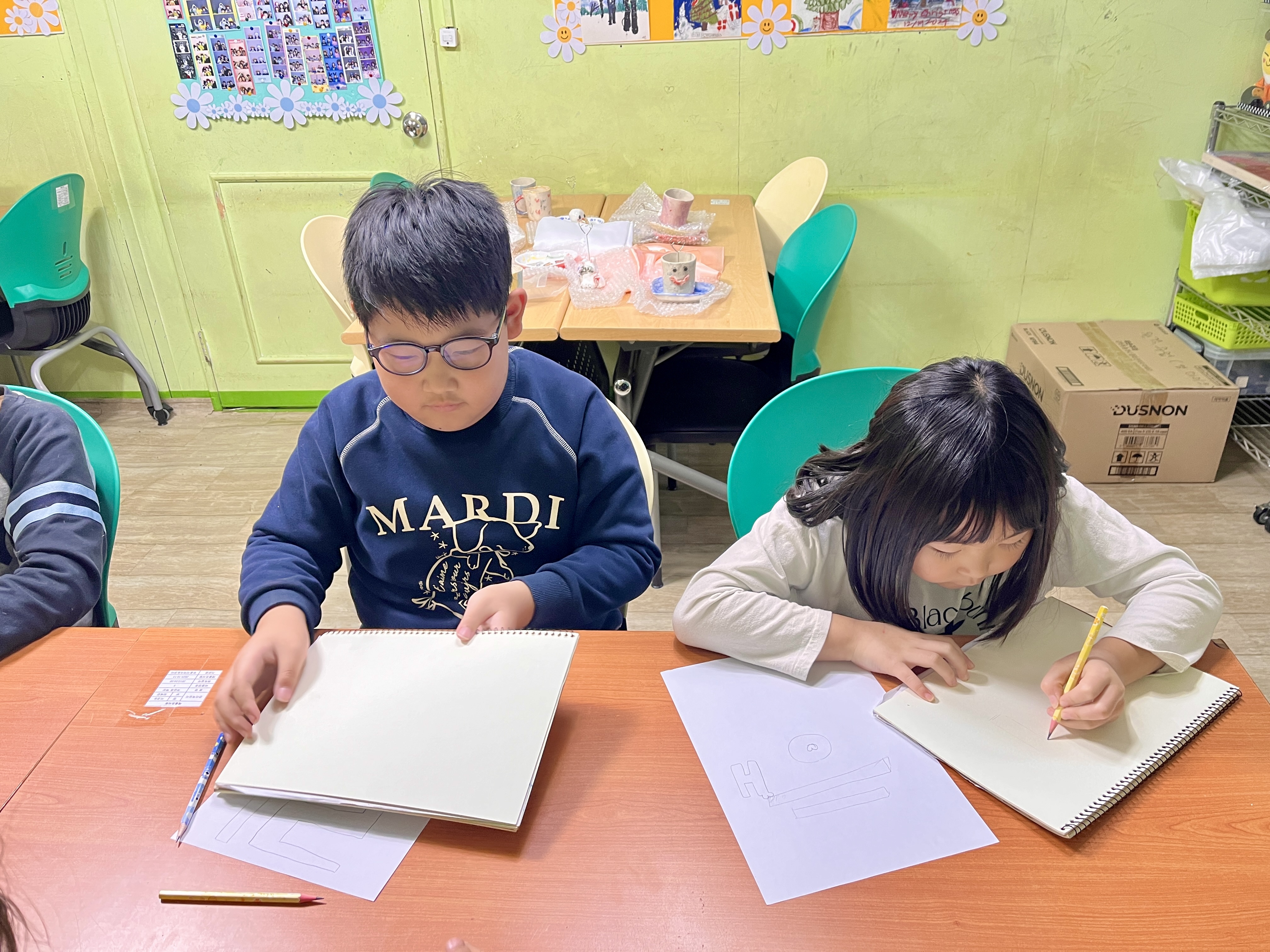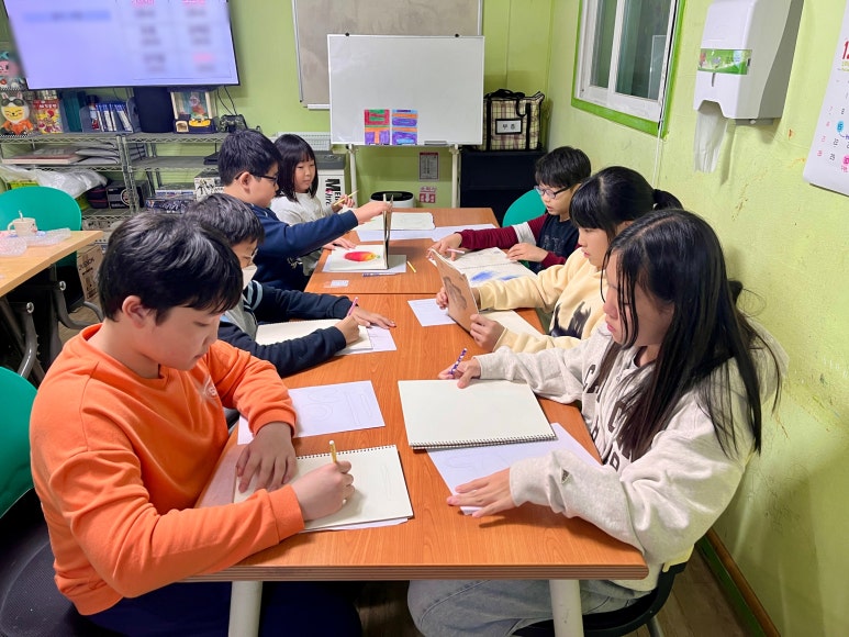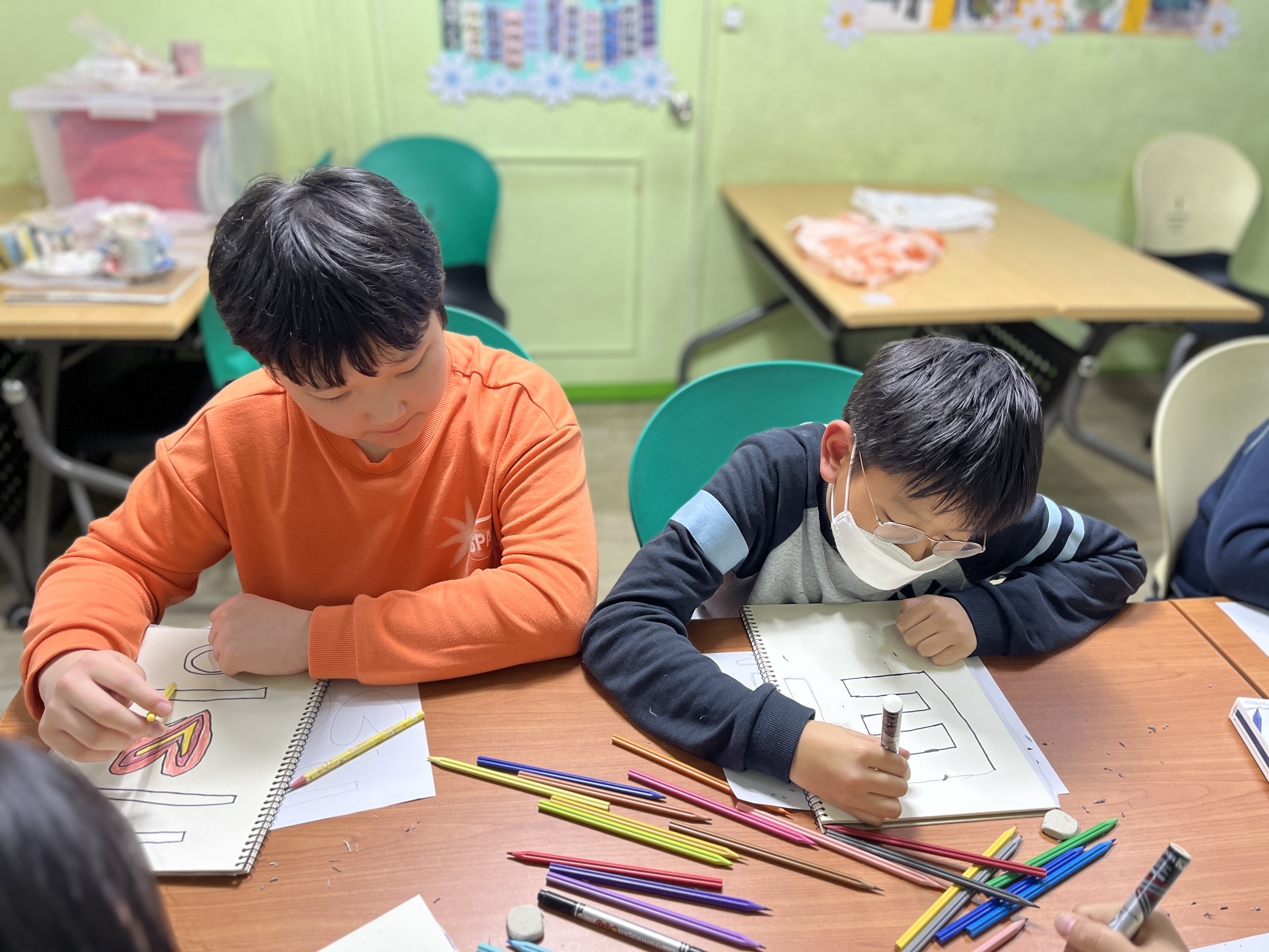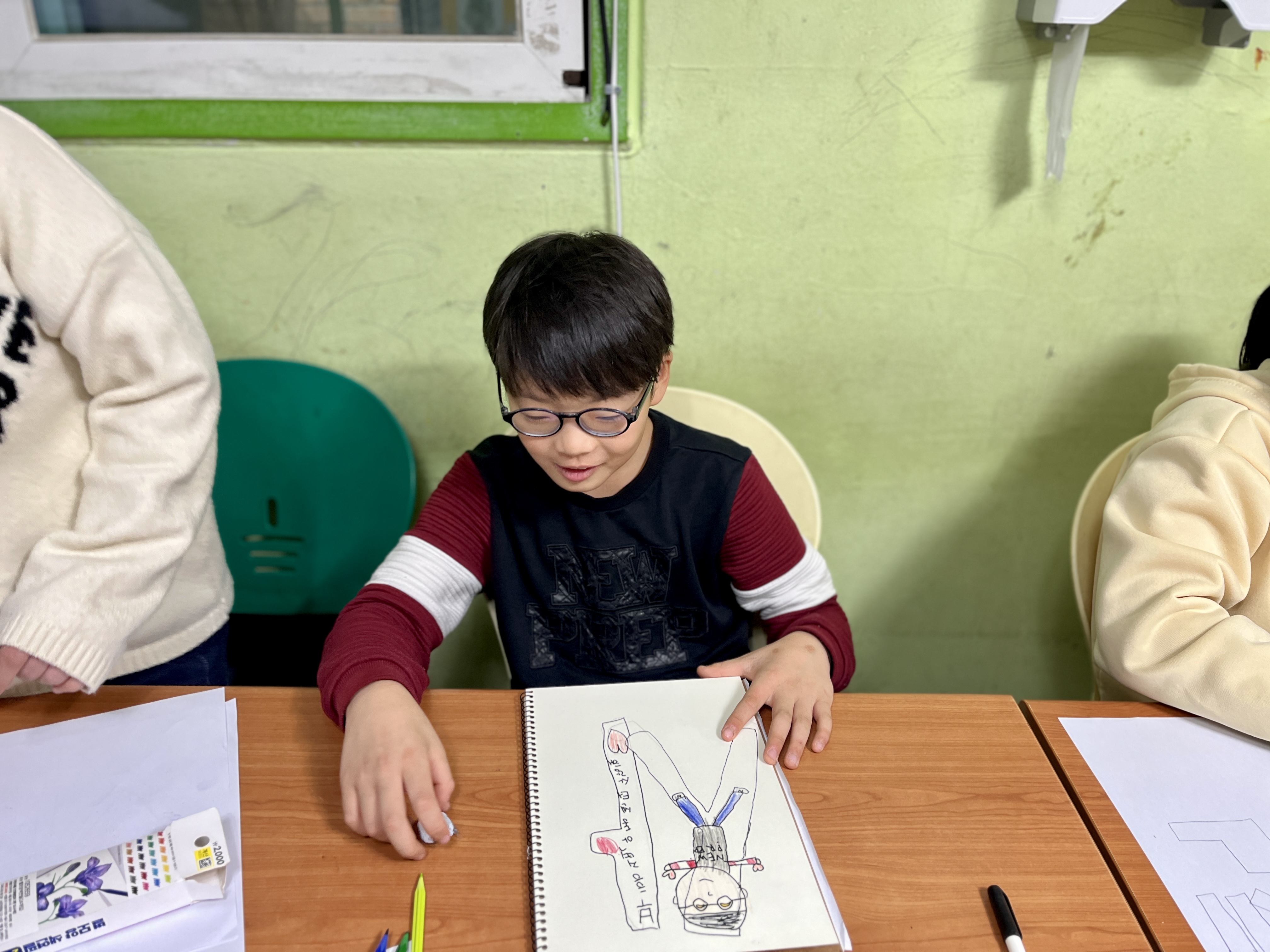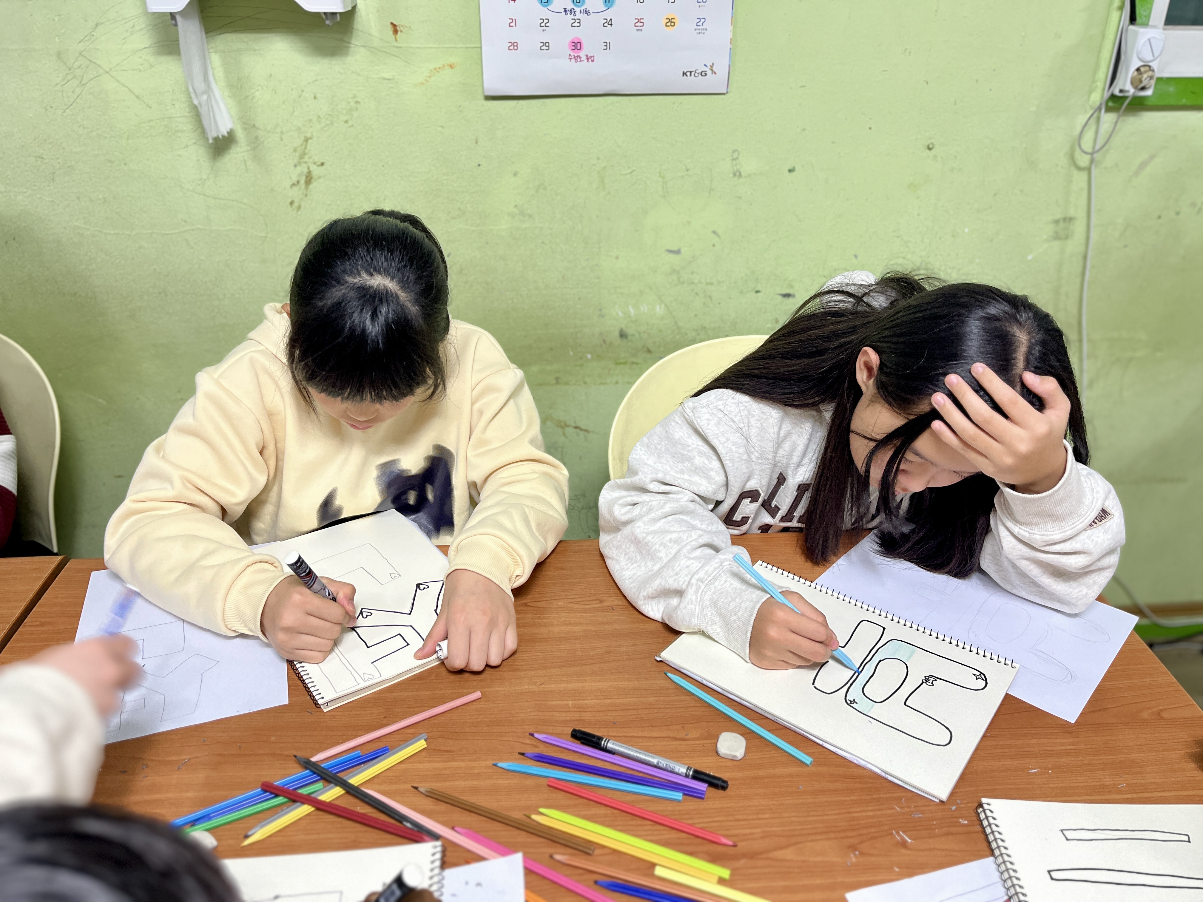전시회 이름을 정해 각자 스케치북에 한 단어씩 적고, 그림을 그려 전시회의 타이틀을 완성했는데요.
