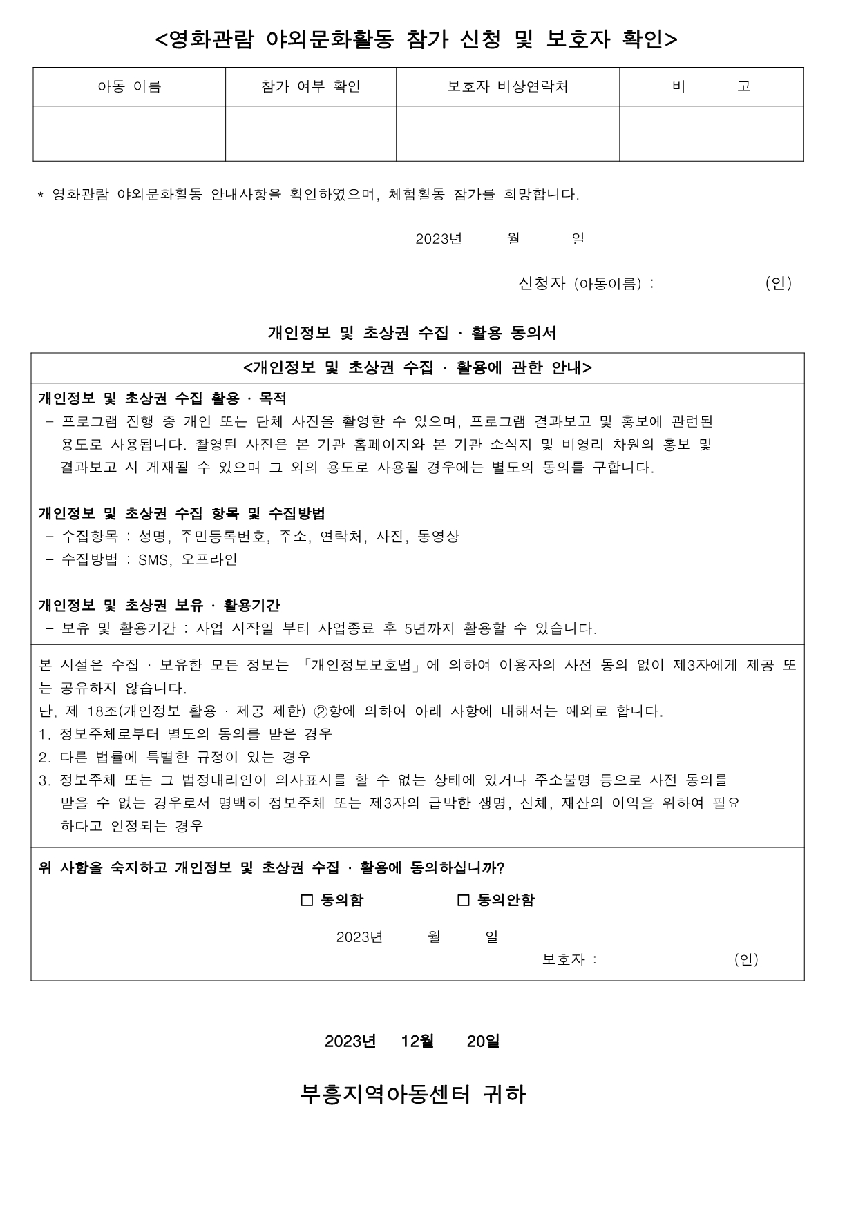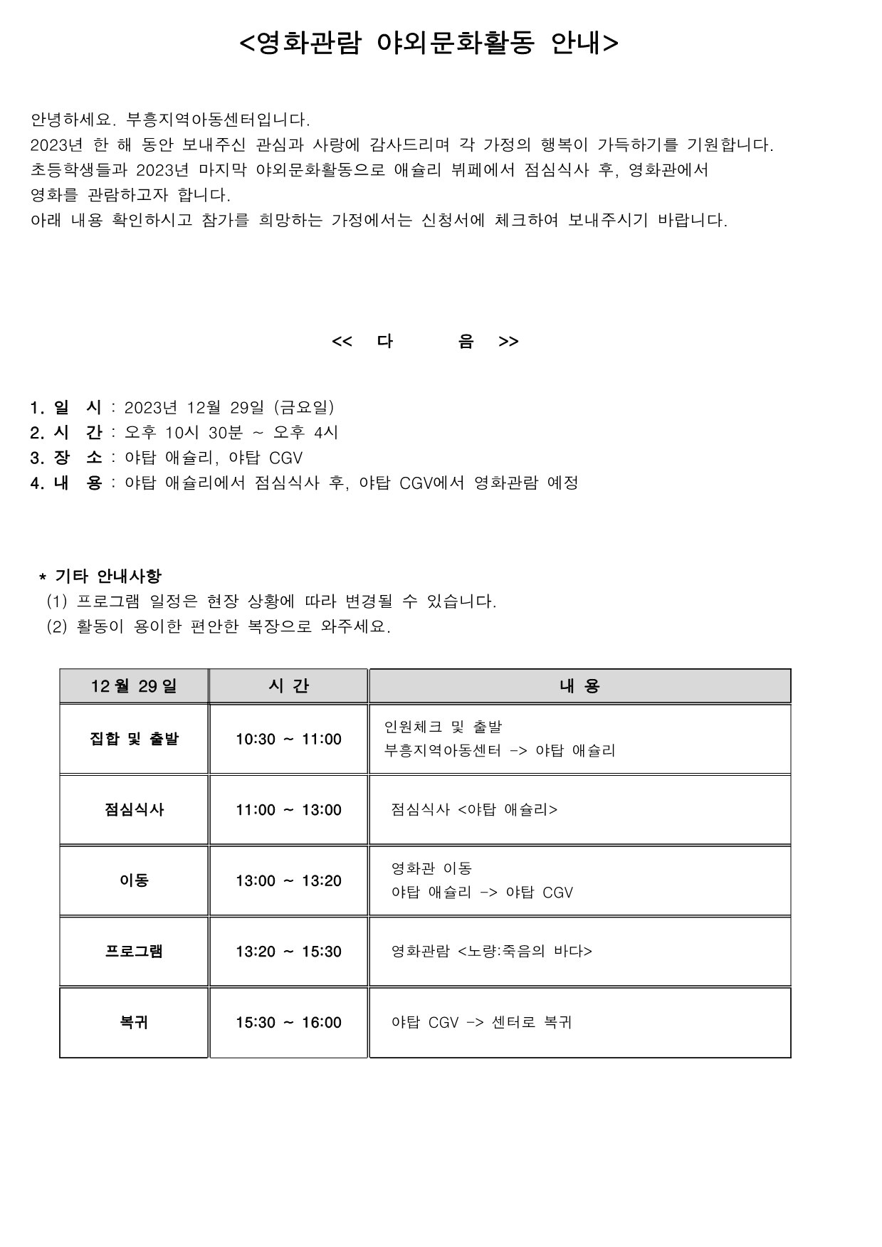하위메뉴 센터소개 지역아동센터란 역할 및 서비스 부흥소개 찾아오시는길 부흥소식 공지사항 가정통신문 행사앨범 센터일정 월별식단 프로그램안내 프로그램 교육일정 자원봉사/후원 후원안내 부흥엔젤스 커뮤니티 한줄메모 자유게시판 부흥앨범 동영상 함께해요 사이버상담실 자료실 본문 가정통신문 홈 > 센터소개 > 지역아동센터란 > 역할 및 서비스 > 부흥소개 > 찾아오시는길 > 부흥소식 > 공지사항 > 가정통신문 > 행사앨범 > 센터일정 > 월별식단 > 프로그램안내 > 프로그램 > 교육일정 > 자원봉사/후원 > 후원안내 > 부흥엔젤스 > 커뮤니티 > 한줄메모 > 자유게시판 > 부흥앨범 > 동영상 > 함께해요 > 사이버상담실 > 자료실 재능기부하기 글보기 제 목 가정통신문 2023-13호 (2023.12.20) 작성자 관리자 등록일 2023-12-26 조회수 261 글 등록시 입력한 비밀번호를 입력해 주세요. 이전글/다음글 목록 다음글가정통신문 2023-14호 (2023.12.28)이전글가정통신문 2023-12호 (2023.11.30)