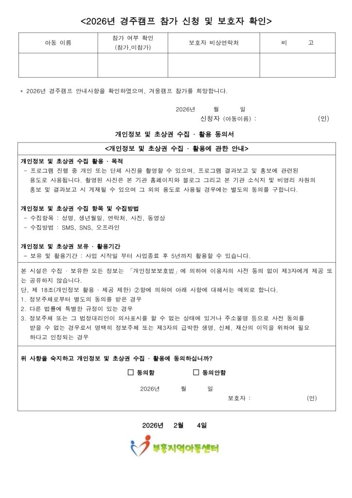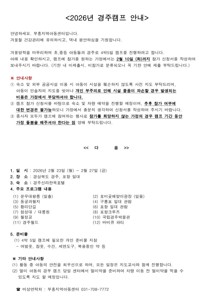 하위메뉴 센터소개 지역아동센터란 역할 및 서비스 부흥소개 찾아오시는길 부흥소식 공지사항 가정통신문 행사앨범 센터일정 월별식단 프로그램안내 프로그램 교육일정 자원봉사/후원 후원안내 부흥엔젤스 커뮤니티 한줄메모 자유게시판 부흥앨범 동영상 함께해요 사이버상담실 자료실 본문 가정통신문 홈 > 센터소개 > 지역아동센터란 > 역할 및 서비스 > 부흥소개 > 찾아오시는길 > 부흥소식 > 공지사항 > 가정통신문 > 행사앨범 > 센터일정 > 월별식단 > 프로그램안내 > 프로그램 > 교육일정 > 자원봉사/후원 > 후원안내 > 부흥엔젤스 > 커뮤니티 > 한줄메모 > 자유게시판 > 부흥앨범 > 동영상 > 함께해요 > 사이버상담실 > 자료실 재능기부하기 글보기 제 목 가정통신문 2026-3호 (2026.02.04) 작성자 부흥지역아동센터 등록일 2026-03-03 조회수 5 글 등록시 입력한 비밀번호를 입력해 주세요. 이전글/다음글 목록 이전글가정통신문 2026-2호 (2026.01.28)