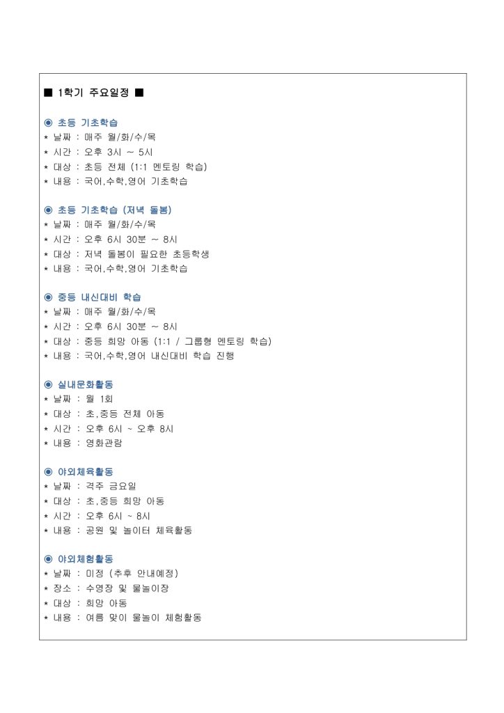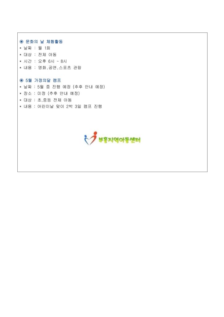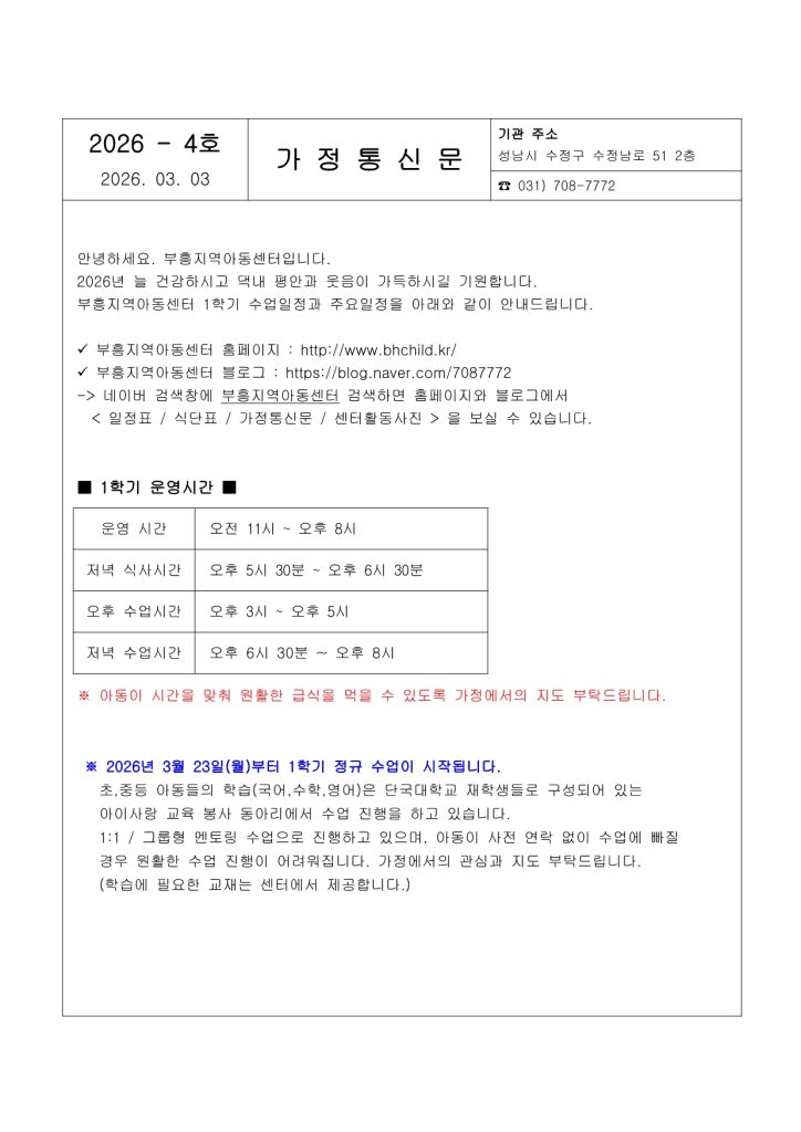하위메뉴 센터소개 지역아동센터란 역할 및 서비스 부흥소개 찾아오시는길 부흥소식 공지사항 가정통신문 행사앨범 센터일정 월별식단 프로그램안내 프로그램 교육일정 자원봉사/후원 후원안내 부흥엔젤스 커뮤니티 한줄메모 자유게시판 부흥앨범 동영상 함께해요 사이버상담실 자료실 본문 가정통신문 홈 > 센터소개 > 지역아동센터란 > 역할 및 서비스 > 부흥소개 > 찾아오시는길 > 부흥소식 > 공지사항 > 가정통신문 > 행사앨범 > 센터일정 > 월별식단 > 프로그램안내 > 프로그램 > 교육일정 > 자원봉사/후원 > 후원안내 > 부흥엔젤스 > 커뮤니티 > 한줄메모 > 자유게시판 > 부흥앨범 > 동영상 > 함께해요 > 사이버상담실 > 자료실 재능기부하기 글보기 제 목 가정통신문 2026-4호 (2026.03.03) 작성자 부흥지역아동센터 등록일 2026-03-04 조회수 6 글 등록시 입력한 비밀번호를 입력해 주세요. 이전글/다음글 목록 이전글식품 알레르기 설문조사 안내