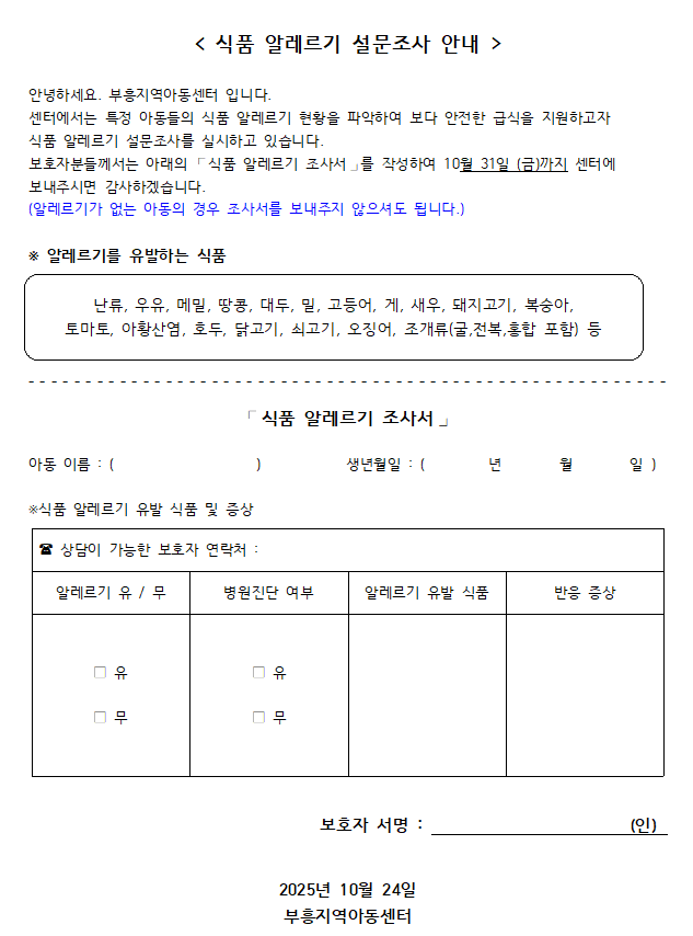 하위메뉴 센터소개 지역아동센터란 역할 및 서비스 부흥소개 찾아오시는길 부흥소식 공지사항 가정통신문 행사앨범 센터일정 월별식단 프로그램안내 프로그램 교육일정 자원봉사/후원 후원안내 부흥엔젤스 커뮤니티 한줄메모 자유게시판 부흥앨범 동영상 함께해요 사이버상담실 자료실 본문 가정통신문 홈 > 센터소개 > 지역아동센터란 > 역할 및 서비스 > 부흥소개 > 찾아오시는길 > 부흥소식 > 공지사항 > 가정통신문 > 행사앨범 > 센터일정 > 월별식단 > 프로그램안내 > 프로그램 > 교육일정 > 자원봉사/후원 > 후원안내 > 부흥엔젤스 > 커뮤니티 > 한줄메모 > 자유게시판 > 부흥앨범 > 동영상 > 함께해요 > 사이버상담실 > 자료실 재능기부하기 글보기 제 목 식품 알레르기 설문조사 안내 작성자 부흥지역아동센터 등록일 2025-10-31 조회수 12 글 등록시 입력한 비밀번호를 입력해 주세요. 이전글/다음글 목록 이전글가정통신문 2025-16호 (2025.09.23)